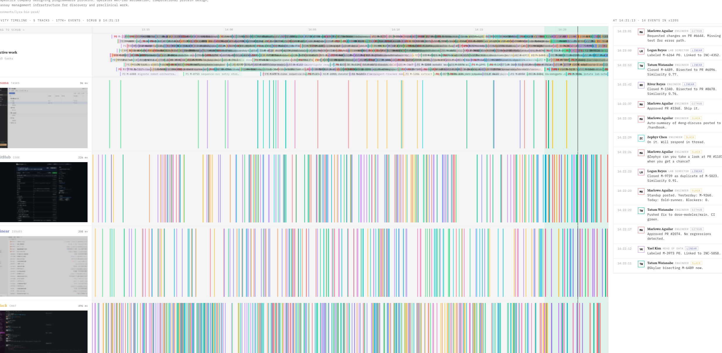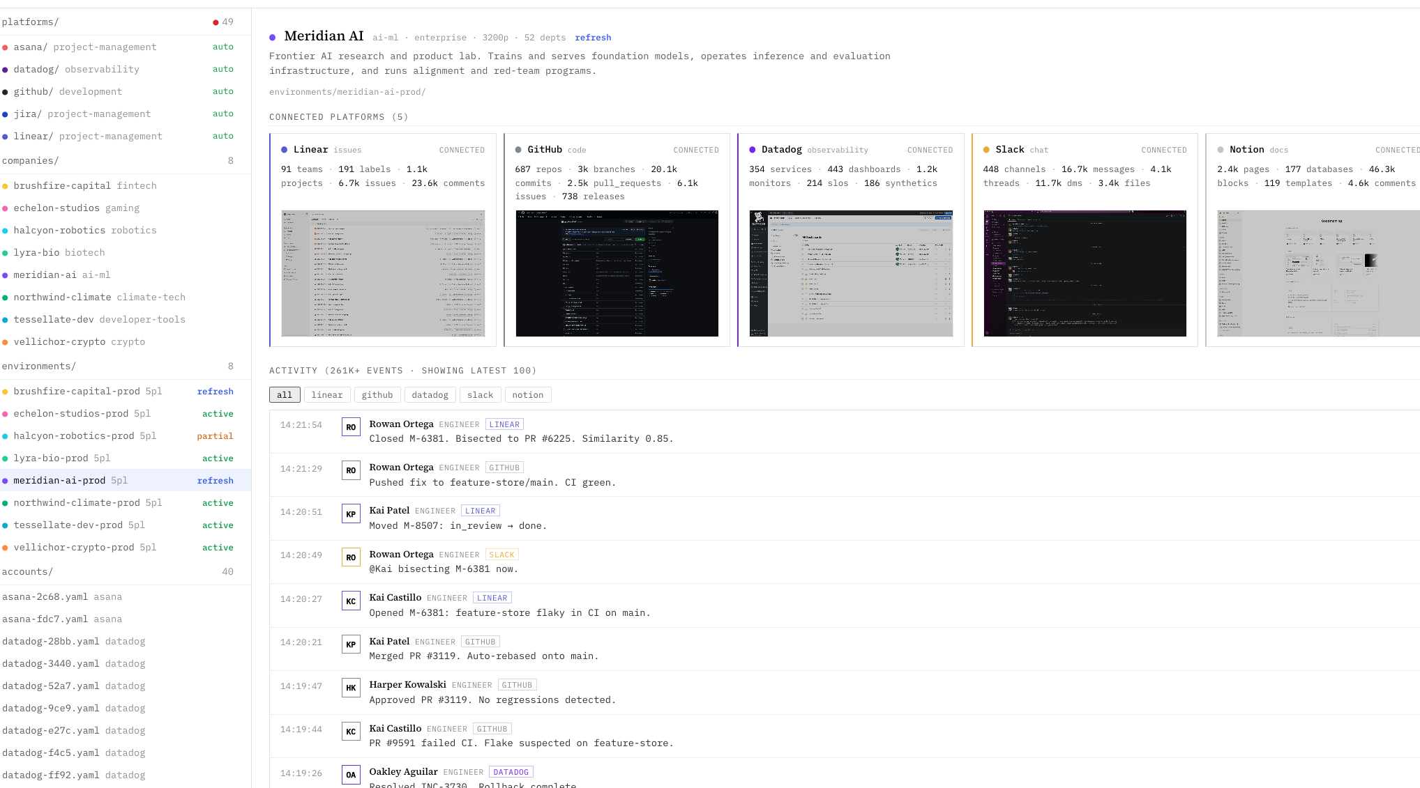 | Personas + workflows | Each persona has a role, a department, and scoped access on each platform. Workflows span tools: a Linear issue, its Notion spec, the GitHub PR that ships it, and the Slack announcement all share the same task ID and owner. Reseed the environment and the references still line up. |